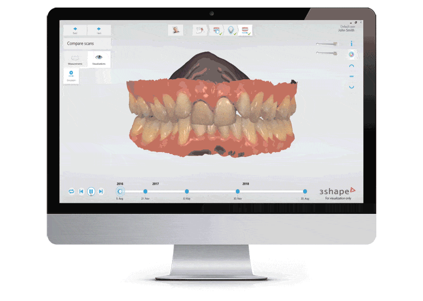 Detecte los cambios dentales de sus pacientes al escanearlo continuamente. Esta forma de monitoreo dental le permite tomar mejores decisiones sobre el tratamiento al documentar visualmente el desarrollo oral y rastrear la progresión del tratamiento con precisión.