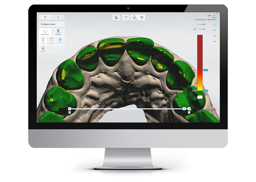 Mida los cambios geométricos de cada diente para identificar el desgaste, el rechinamiento, el astillado y otros cambios volumétricos de los dientes. Use esto para involucrar y educar al paciente cuando sugiera tratamientos preventivos o restaurativos.